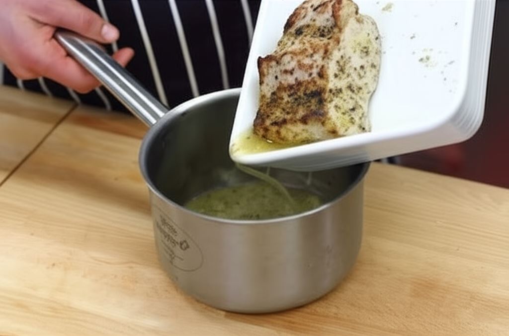 Po upływie tego czasu odłóż mięso na następne 10 minut. Sos, który powstał w trakcie pieczenia, przelej do rondla.