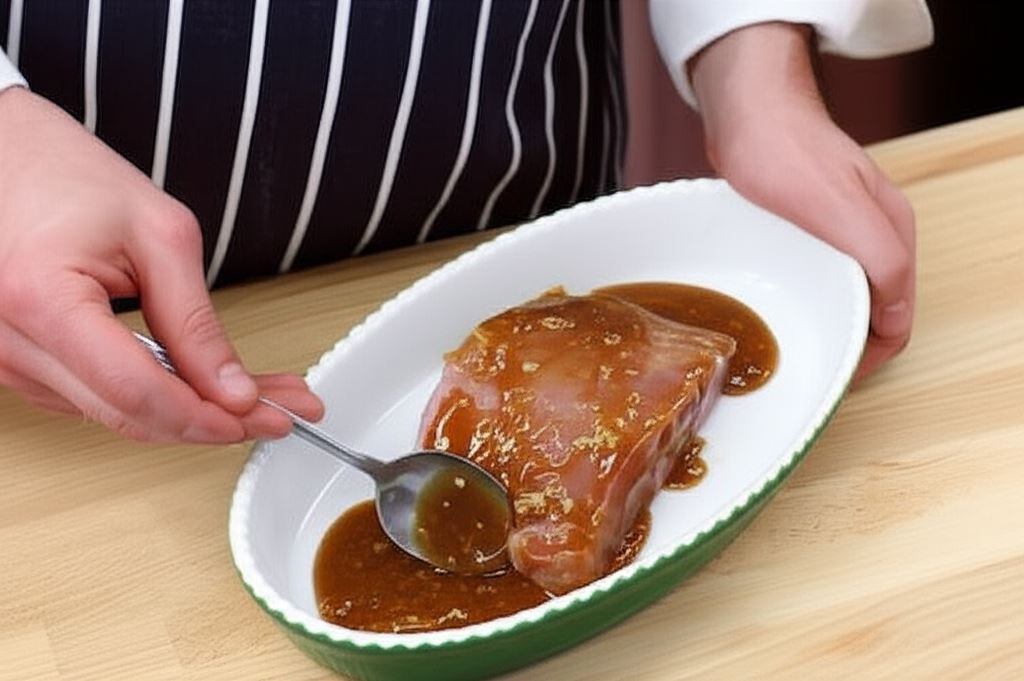 Wyczyść schab i posmaruj go starannie ostudzonym sosem. Potem umieść w naczyniu żaroodpornym i wstaw na godzinę do lodówki.