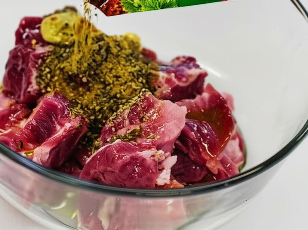 Mięso potnij w kostkę 1,5 cm na 1,5 cm, posyp przyprawą Knorr, po czym dodaj musztardę, majeranek i oliwę. Całość starannie wymieszaj i odstaw na bok.