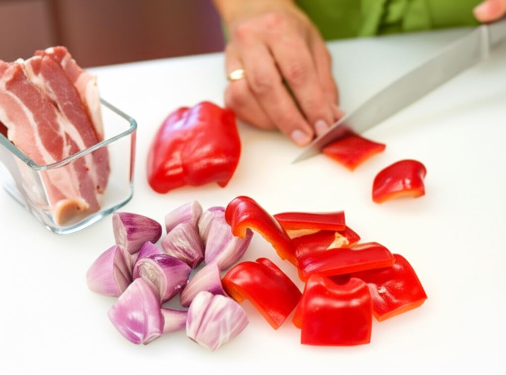 Paprykę pokrój w kostkę 1,5 cm. Cebulki obierz i przetnij na połówki. Boczek pokrój na plastry o grubości 0,5 cm i wymiarach 1,5 na 1,5 cm