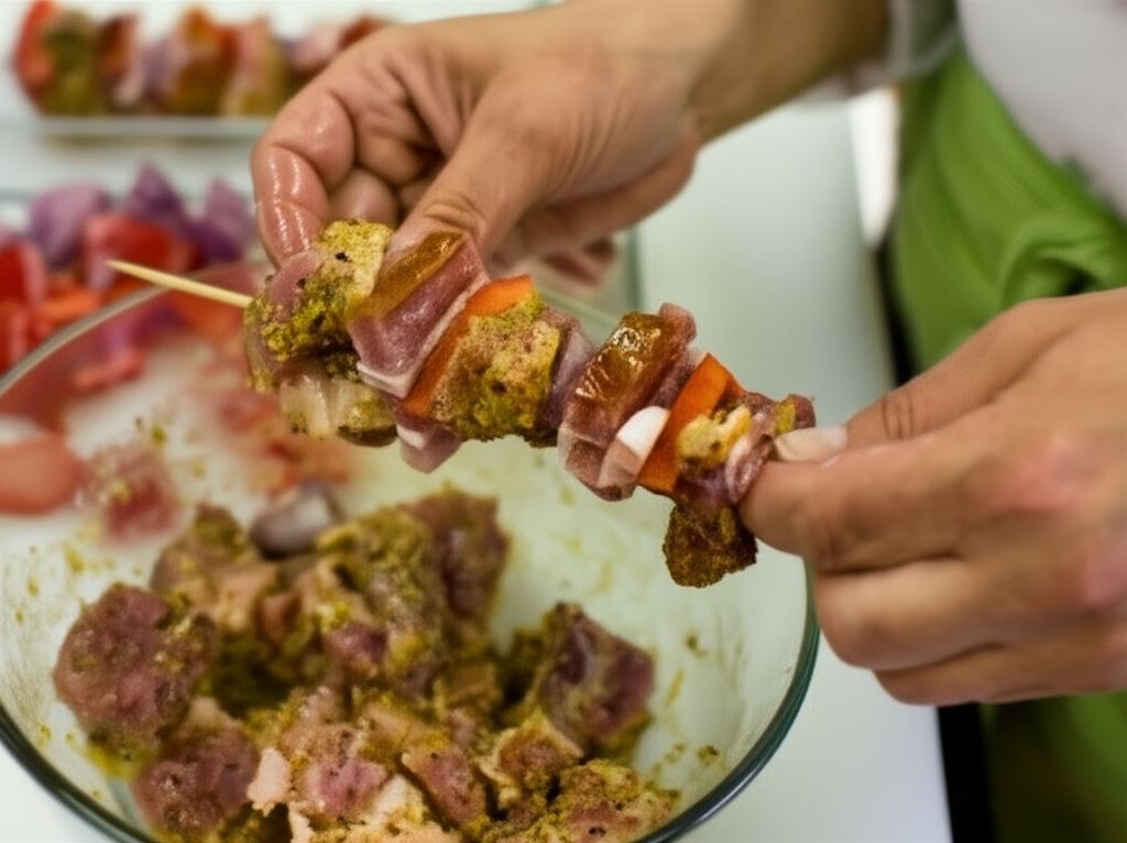 Sekret udanych szaszłyków tkwi w marynacie! Połączenie majeranku, musztardy sarepskiej i przyprawy do wieprzowiny nadaje mięsu niepowtarzalny aromat. Ważne jest też odpowiednie krojenie składników – wszystkie powinny mieć podobną wielkość (około 1,5 cm), co zapewnia równomierne pieczenie.