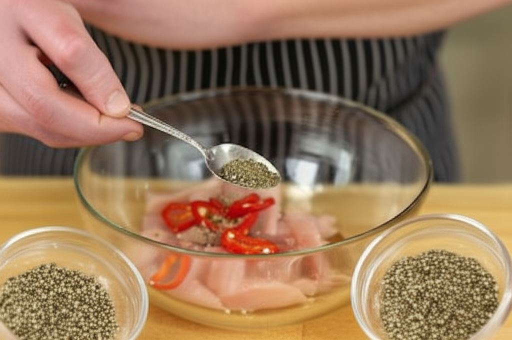 Filety z kurczaka osusz i potnij w cienkie paski. Umieść w misce, wlej połowę oleju, dodaj pieprz, szczyptę soli oraz pokrojone na krążki chilli. Zamieszaj i odstaw na parę minut.