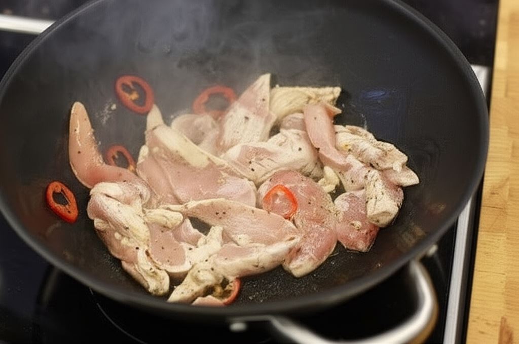 Podgrzej wok i obsmaż kawałki kurczaka, mieszając bez przerwy. Potem wyjmij je i odłóż na bok.