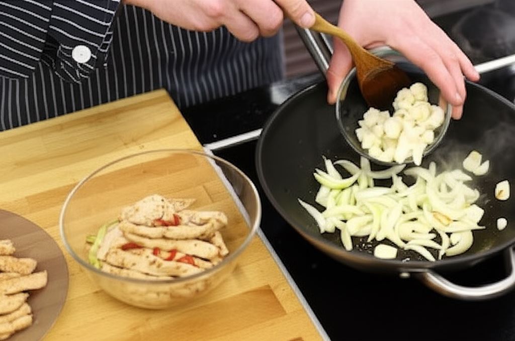 Danie przygotowujesz szybko i sprawnie – najpierw marynujesz kurczaka z chili, następnie przesmażasz go na rozgrzanym woku. Kalafior i cebula dochodzą w kolejnym etapie, a całość dopełnia aromatyczny sos, który podczas krótkiego gotowania przenika wszystkie składniki. Podane z ryżem stanowi pełnowartościowy posiłek, który przeniesie Cię w kulinarną podróż do Azji.