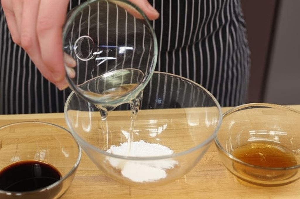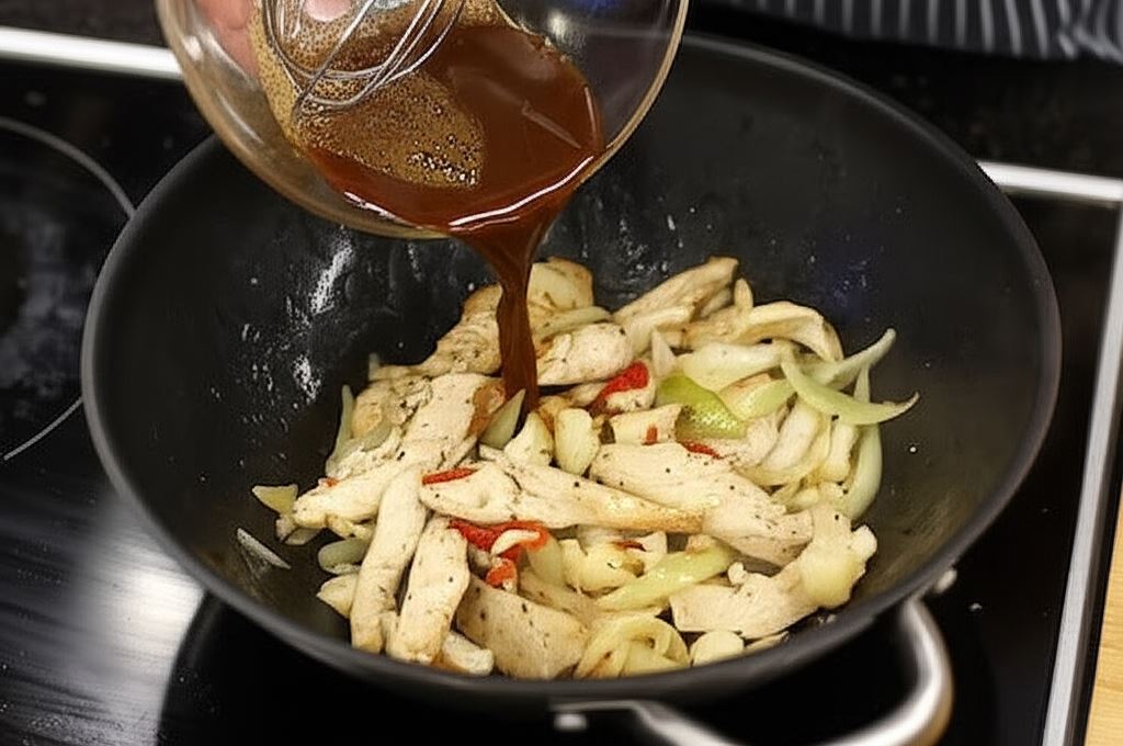 W miseczce wymieszaj sos rybny, sos sojowy, ocet ryżowy oraz skrobię, wszystko dokładnie połącz, po czym dodaj do woka i zalej bulionem (woda zagotowana z rosołem z kury Knorr).