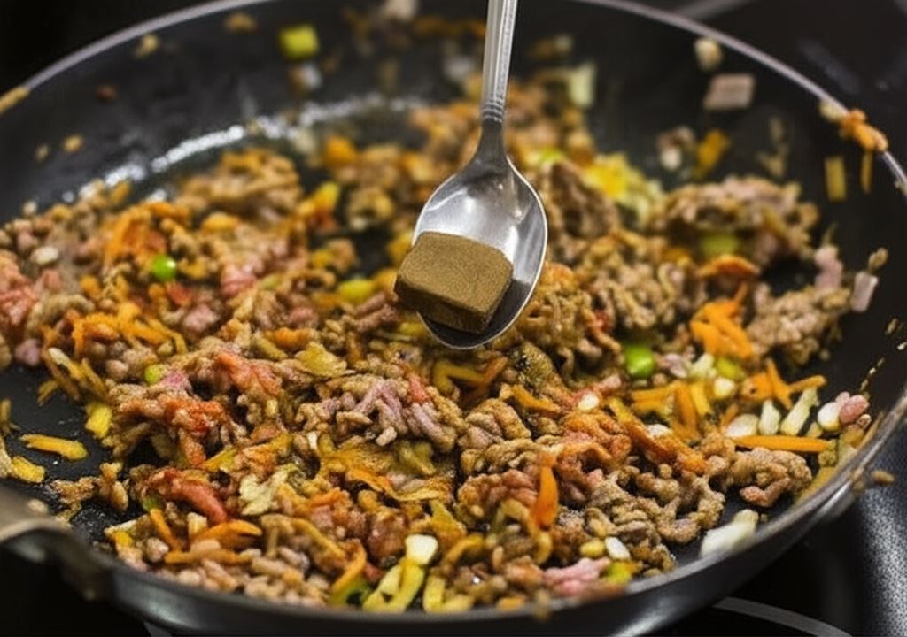 Wrzuć wołowinę, przecier pomidorowy i kostkę Knorr. Wlej 0,5 litra wody i duś aż płyn odparuje. Wsyp zioła.