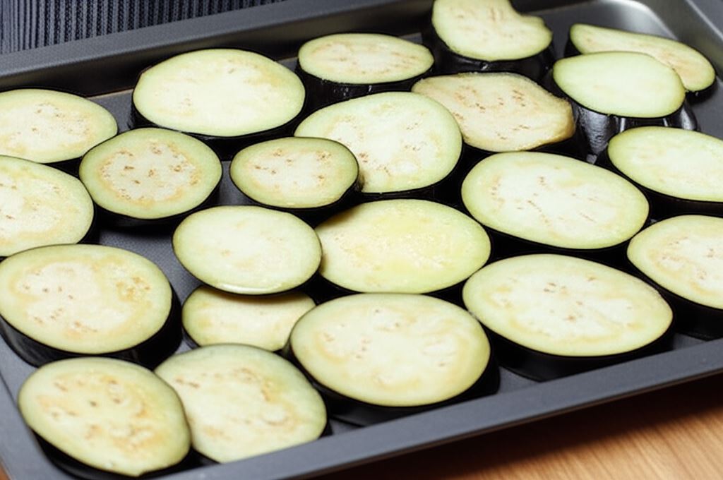 Bakłażana opłucz, potnij w plastry o grubości 1 cm, ułóż na blasze do pieczenia, polej oliwą i zapiekaj 5 min. w temperaturze 180 st. C.