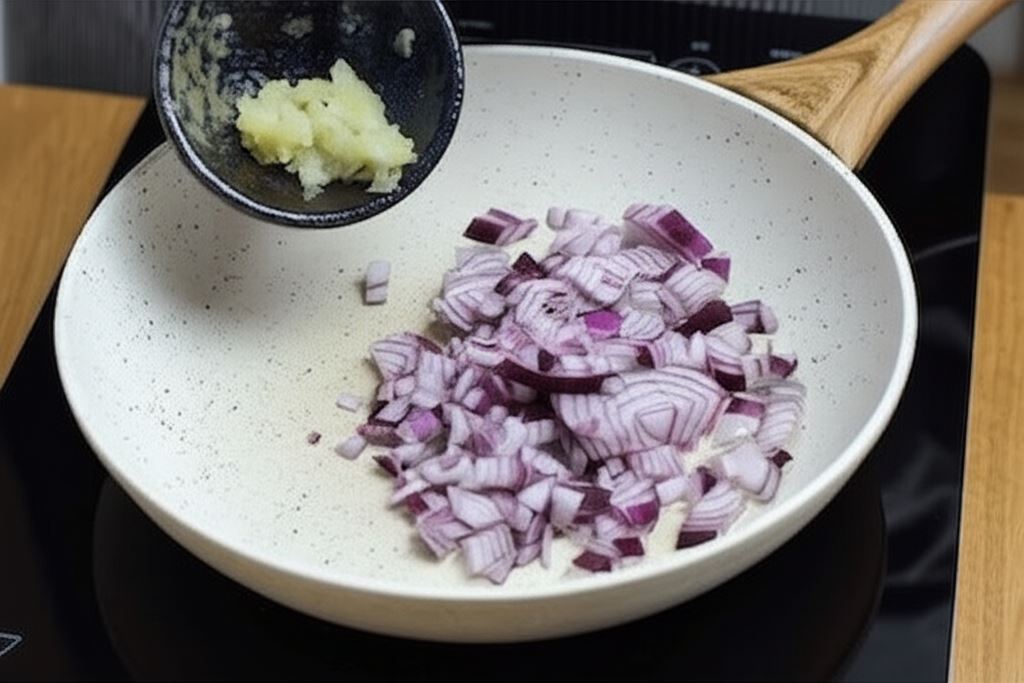 Obierz cebule i czosnek, następnie posiekaj. Zrumień na patelni używając niewielkiej ilości oliwy.