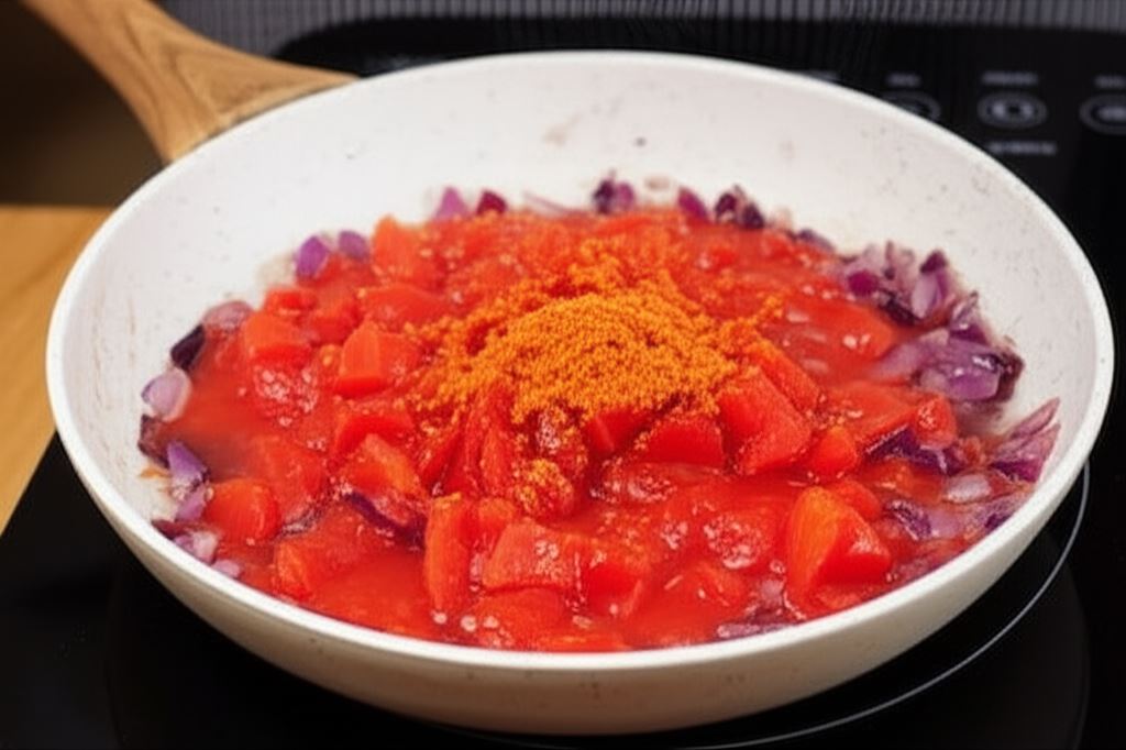 Kiedy cebula stanie się szklista wsyp pomidory pelatTi, fix spaghetti i wodę. Wszystko wymieszaj i gotuj na małym ogniu 10 min.