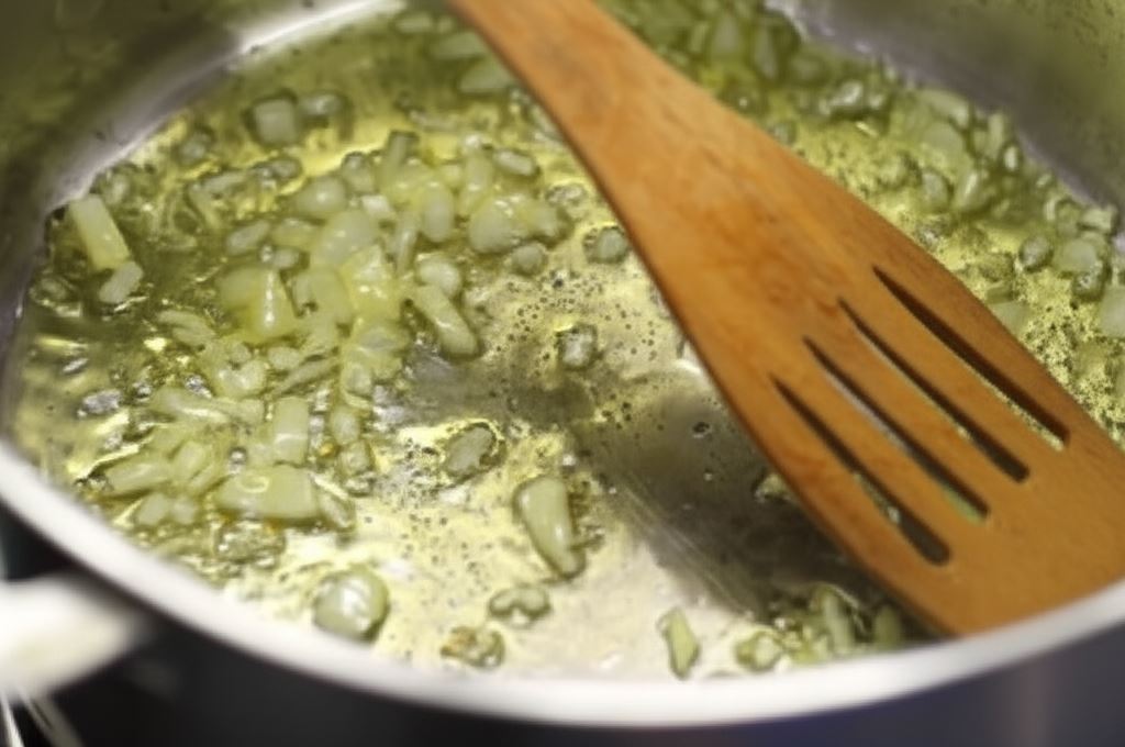 W dużym garnku podgrzej oliwę z oliwek i podsmaż warzywa rozpoczynając od cebuli i czosnku.
