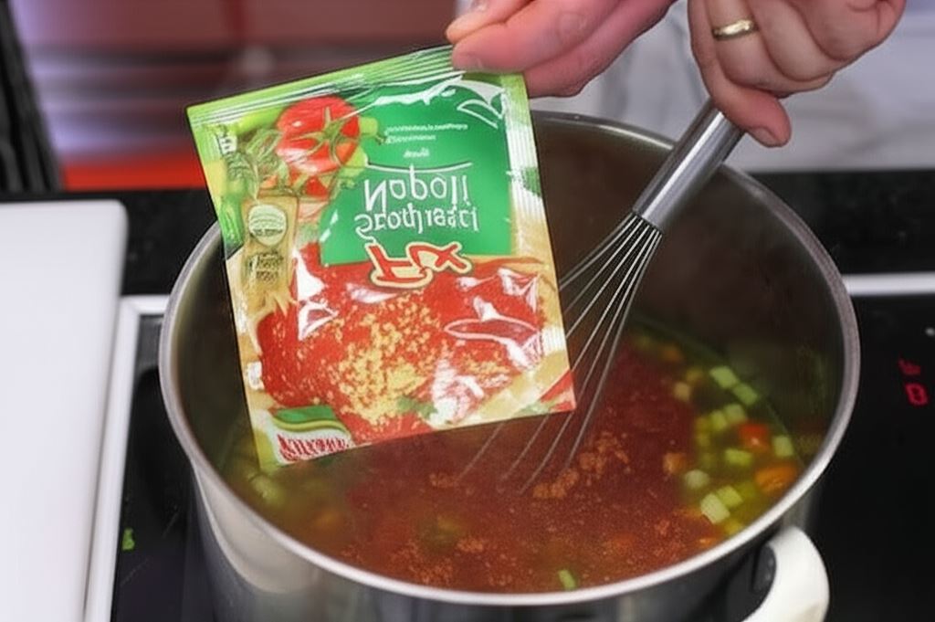 Następnie dolej bulion. Wsyp Fix Knorr i delikatnie doprowadź zupę do wrzenia.