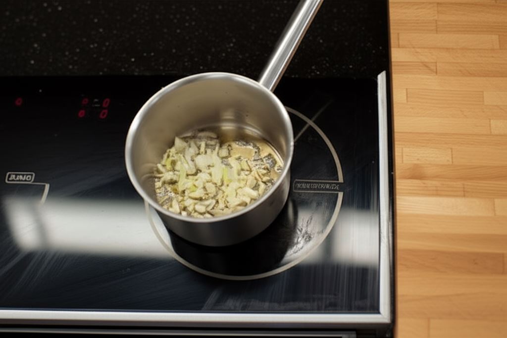 Cebulę i czosnek posiekaj w kostkę. Zrumień w rondlu.