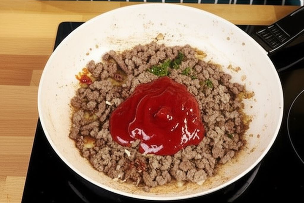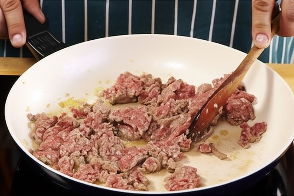 Rozgrzej oliwę na patelni i zeszklij szalotkę pokrojoną w małą kostkę. Następnie wsyp mięso i smaż ciągle mieszając, by nie powstały grudki.