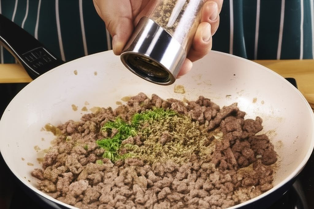 Dorzuć do mięsa świeżo zmielony pieprz, oregano oraz posiekane zioła, pietruszkę i rozmaryn. Całość starannie wymieszaj i smaż przez moment.