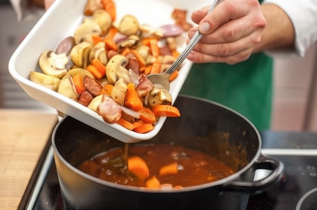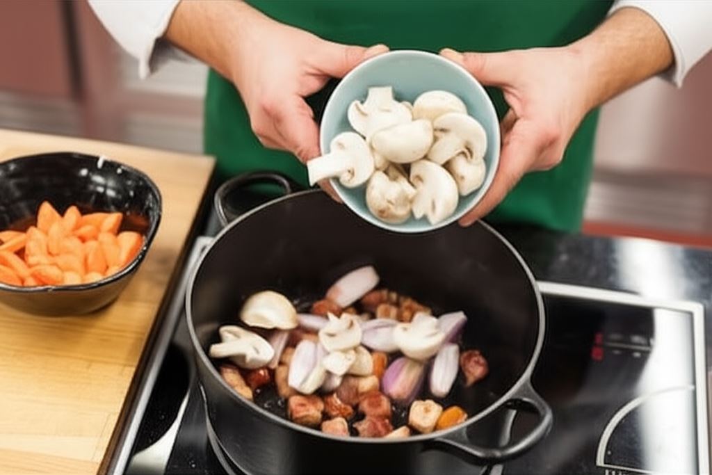 Na rozgrzanej oliwie w garnku zrumień pokrojony w większą kostkę boczek. Kiedy dobrze się wytopi, wsyp przekrojone na połówki szalotki i smaż przez dłuższy moment, aż się zeszklą. Dorzuć przepołowione pieczarki oraz marchew pokrojoną w półplastry.
