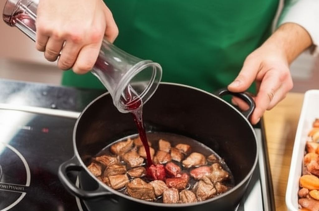 Po tym czasie zbierz podsmażone składniki i odstaw je na bok. W tym samym garnku zrumień pokrojoną w grubą kostkę 2 na 2 cm wołowinę. Gdy lekko się zbrązowi, zalej ją czerwonym winem. Całość gotuj na dużym ogniu aż wino niemal całkowicie odparuje. Dodaj wówczas pomidory z puszki i pół szklanki wody.