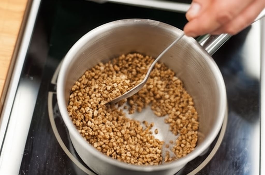 W garnku przygotuj kaszę gryczaną zgodnie z instrukcją producenta. Ugotowaną kaszę serwuj z gulaszem.