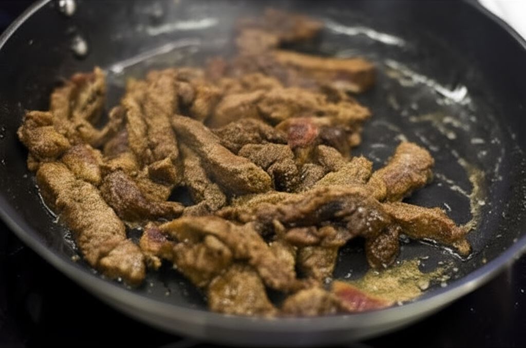 Wlej olej sojowy na rozgrzaną patelnię i umieść wołowinę. Smaż przy dużym ogniu do zbrązowienia mięsa, następnie zdejmij je z patelni i odłóż na bok.