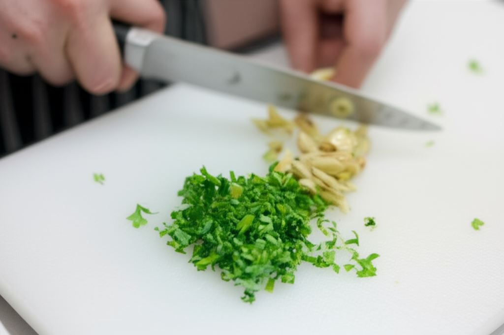 Kostkę Knorr rozetrzyj z olejem. Kolendrę, czosnek i trawę cytrynową posiekaj niezbyt drobno. Dołącz do pasty z kostki.