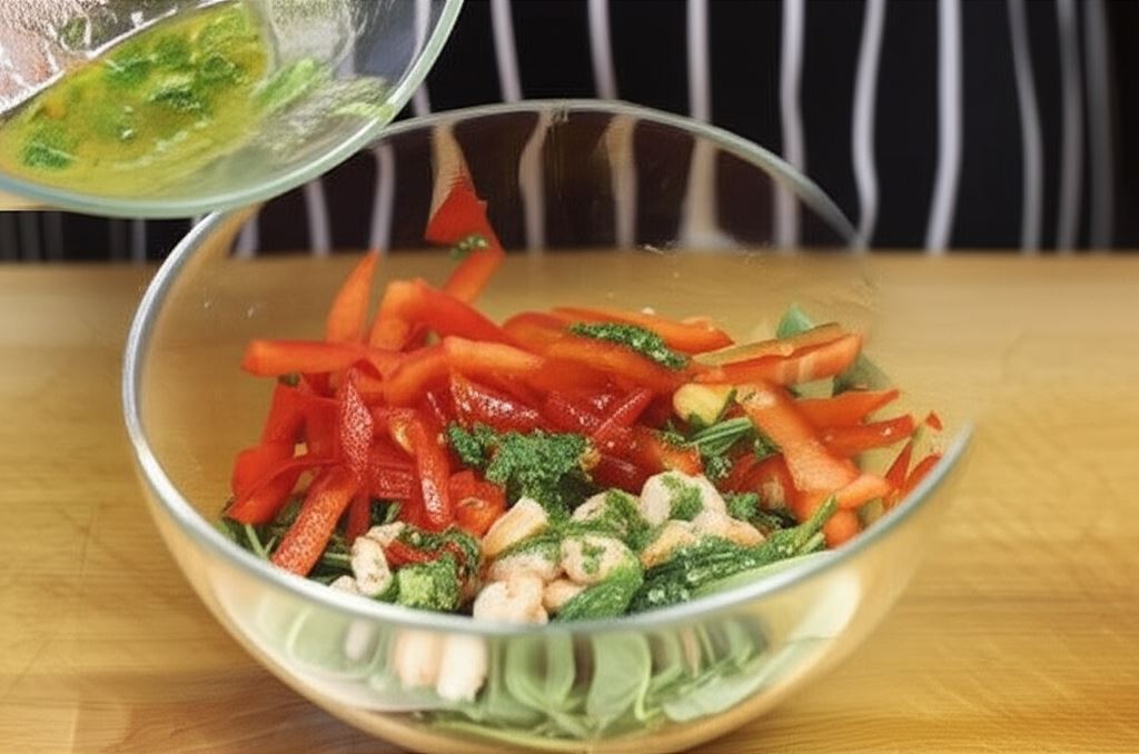 Szpinak i paprykę wymieszaj w misce z ugotowanymi krewetkami. Dodaj przygotowany sos Knorr i połącz.