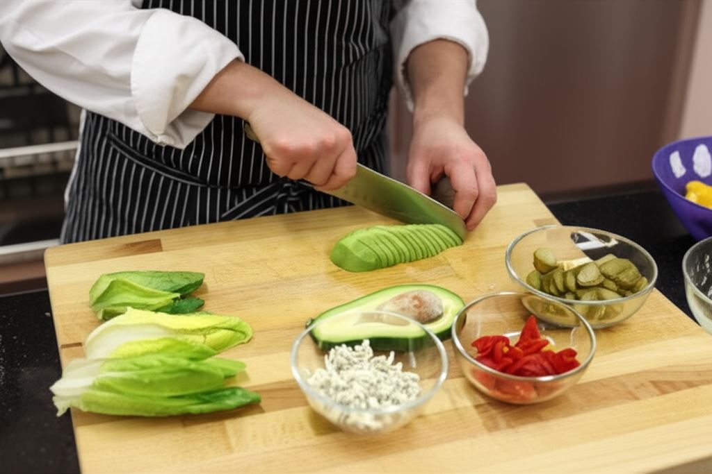 Zetrzyj ser na tarce, paprykę, ogórki i awokado pokrój w plasterki, liście sałaty opłucz i osusz.