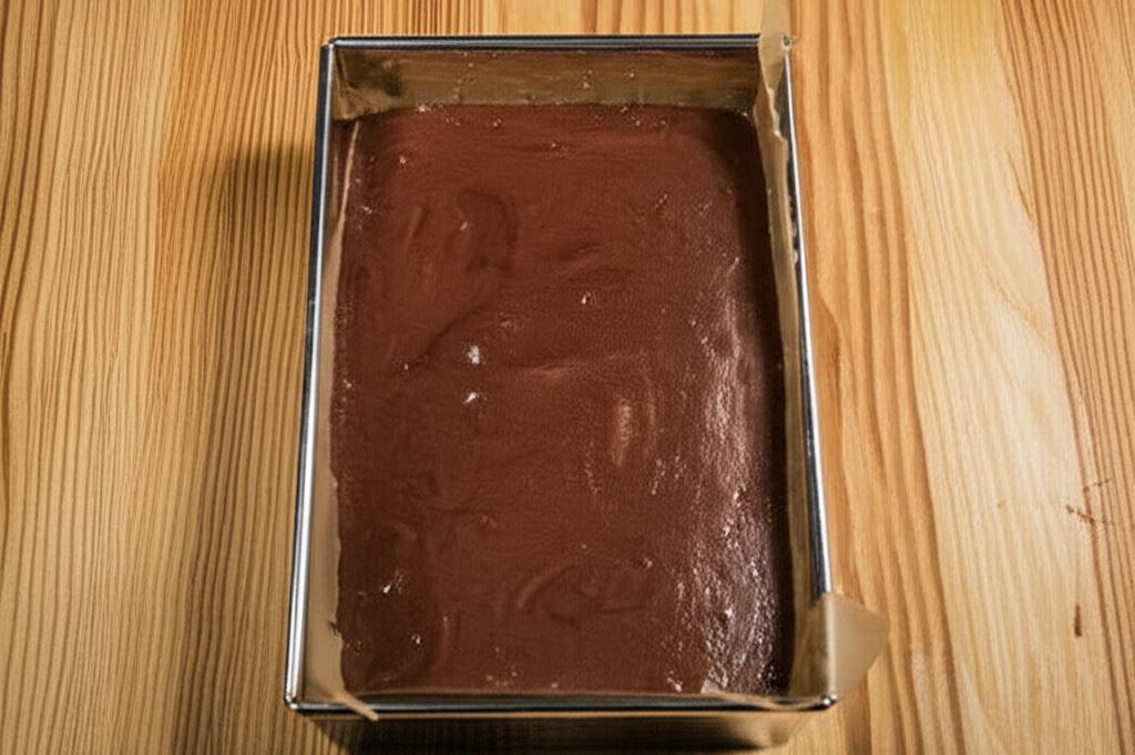 Prostokątną formę do ciasta (ok 25x30cm) wyłóż papierem do pieczenia i posmaruj ciastem. Potem wlej równomiernie biszkopt i piecz w temperaturze 180 stopni przez 20 minut.