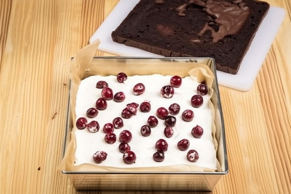Na spodzie formy rozłóż papier do pieczenia. Umieść pierwszą część biszkoptu i rozprowadź na nim lekko przestudzony krem. Rozsyp wiśnie i nałóż na górę drugi biszkopt. Delikatnie dociśnij i schowaj do lodówki na co najmniej 2h.