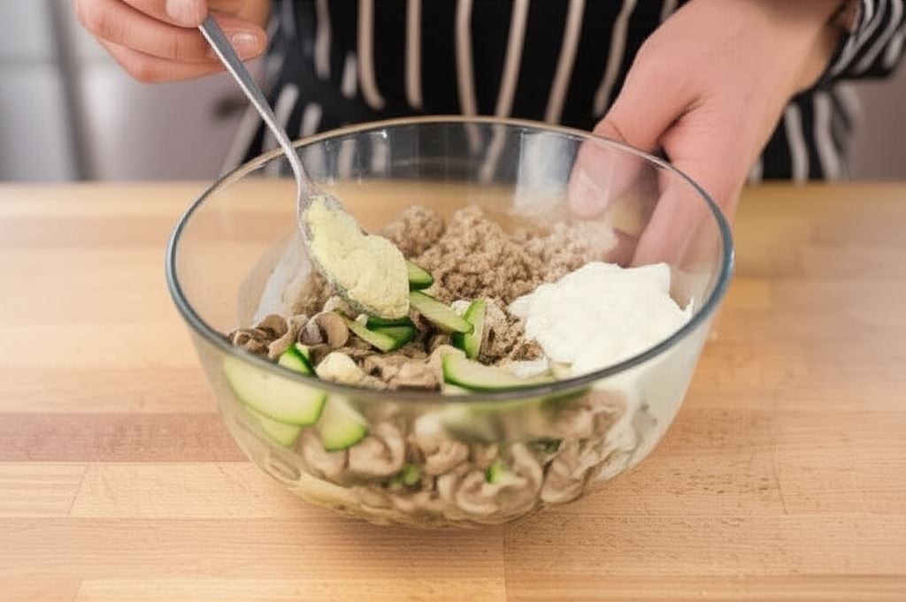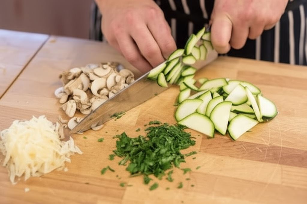 Zetrzyj ser na tarce, posiekaj natkę pietruszki, a pieczarki pokrój w półplasterki. Połowę cukinii podziel na 4 części. Wyciągnij z niej nasiona i pokrój w cienkie plasterki. Cukinię i pieczarki włóż na minutę do wrzącej wody, po czym dokładnie osusz w papierowym ręczniku.