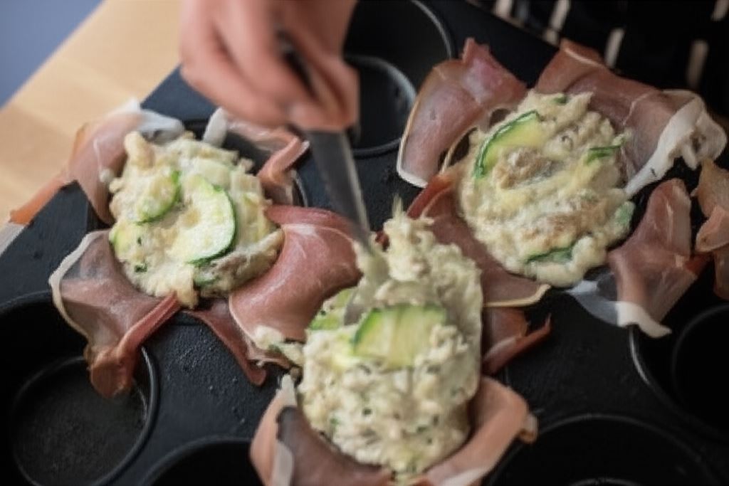 Odkryj nową odsłonę klasycznych muffinek! Nasze wytrawne muffinki w listkach szynki parmeńskiej to prawdziwa uczta dla podniebienia. Delikatne ciasto z kaszą, wzbogacone aromatycznymi pieczarkami, cukinią i natką pietruszki, otulone w chrupiące listki szynki parmeńskiej tworzy niepowtarzalną kompozycję smaków.