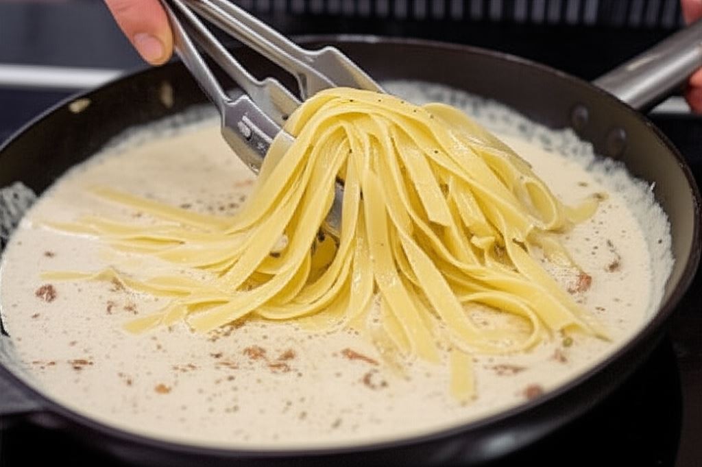 Naturalnie smaczne Tagliatelle z kurczakiem Knorr wymieszaj ze śmietaną i przelej na patelnię, wszystko zagotuj. Sos przypraw do smaku pieprzem, dodaj posiekaną natkę i zamieszaj.