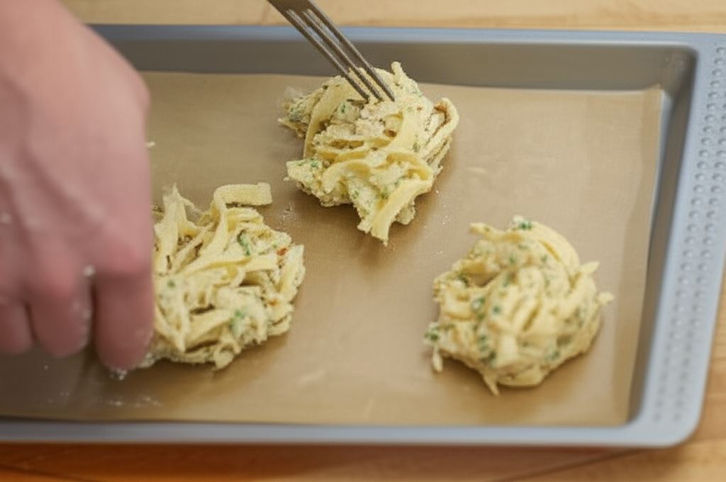 Rozgrzej piekarnik do 175° C. Wyłóż blachę do pieczenia papierem pergaminowym i delikatnie posmaruj tłuszczem. Za pomocą długiego widelca formuj małe gniazdka z makaronu, zawijając je na blasze. Przygotowane w ten sposób wstaw do rozgrzanego piekarnika i piecz przez 8-10 minut. Serwuj jako samodzielne danie lub jako dodatek do mięs, na przykład kurczaka lub wieprzowiny.