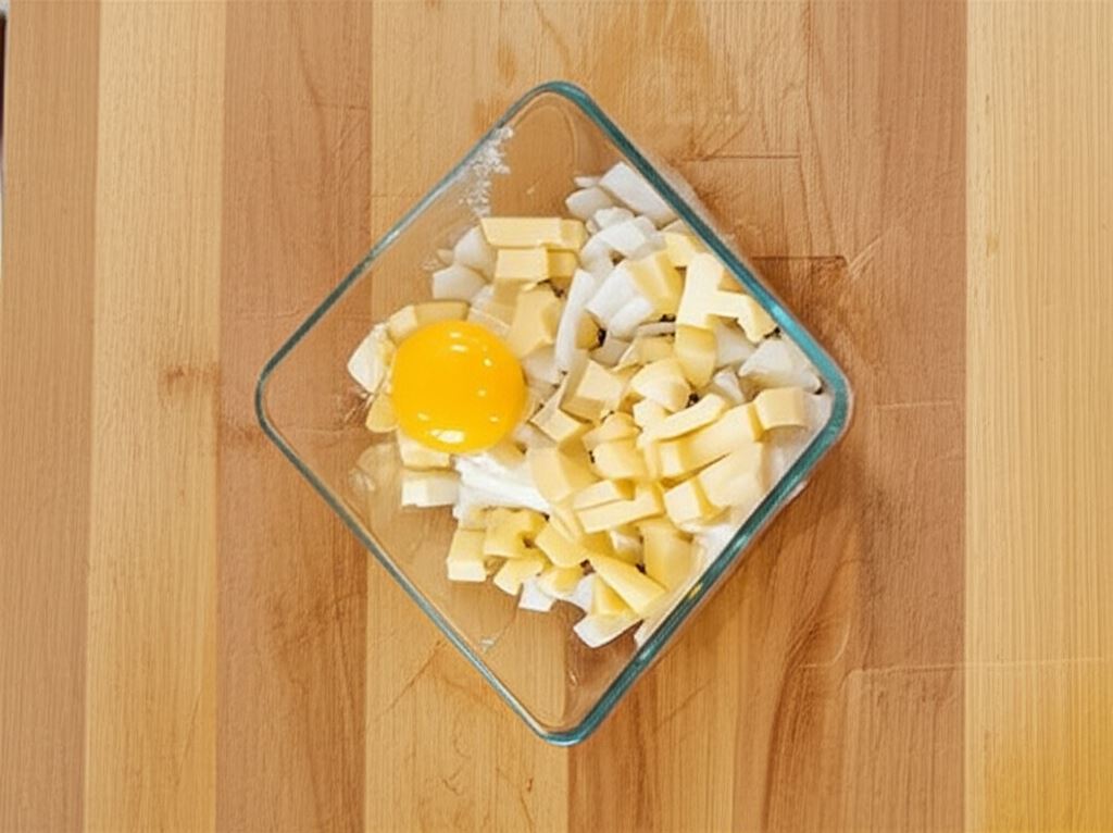 Połącz starty ser żółty z mozzarellą, serem z pleśnią i żółtkami.