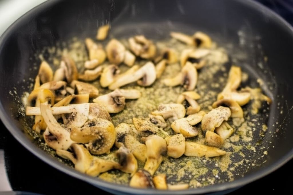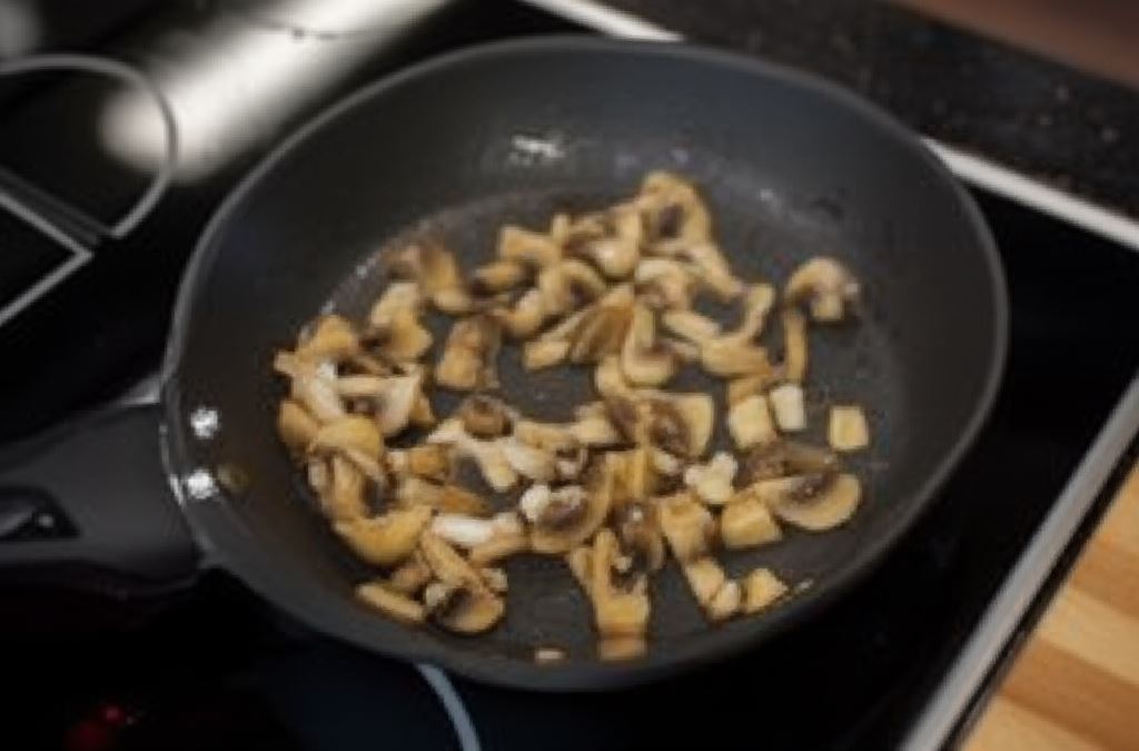 Na patelni obsmaż na maśle pieczarki pokrojone w cząstki.