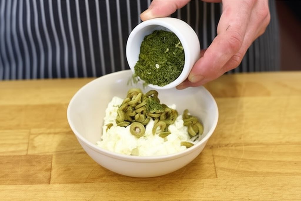 Do twarogu wsyp przyprawę i drobno posiekane oliwki. Wszystko starannie wymieszaj.