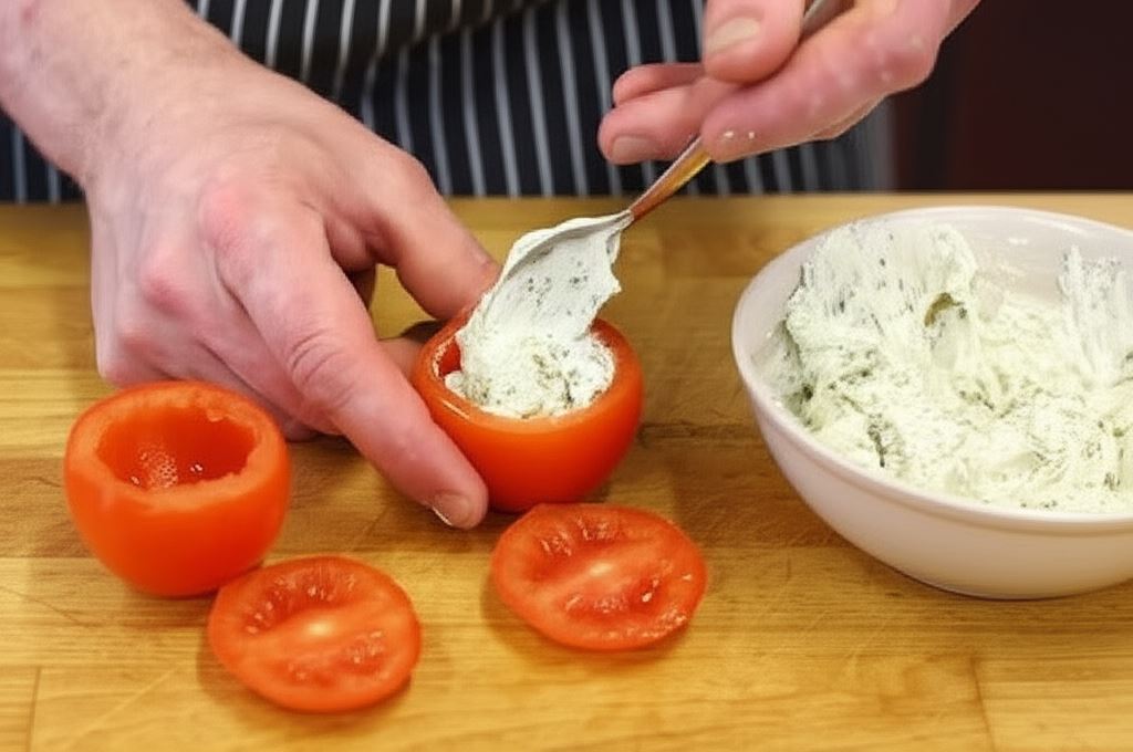 Oczyszczone pomidory pozbaw części nasiennych, a następnie wypełnij je nadzieniem serowym.