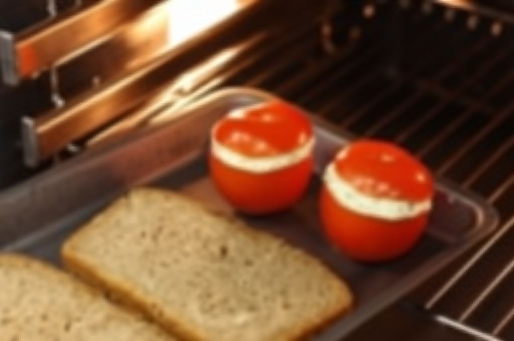 Przygotowane pomidory zapiekaj w piekarniku wraz z kromkami chleba w temperaturze około 180 °C przez około 15 minut. Danie posyp siekanym koperkiem.