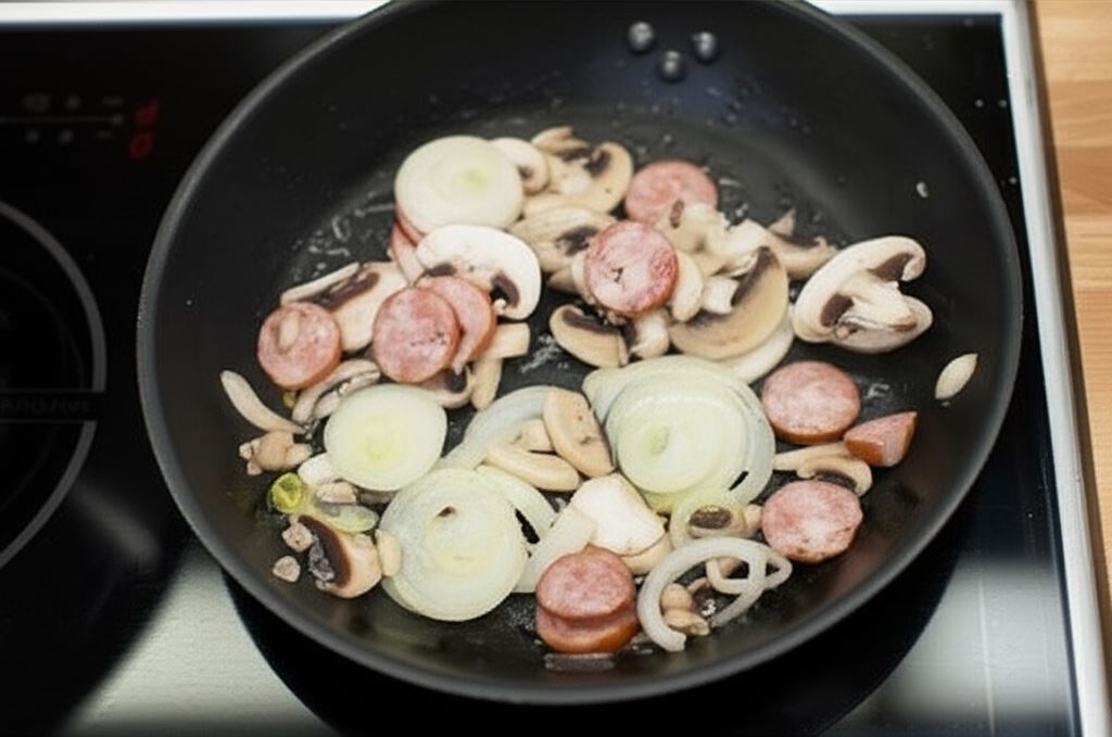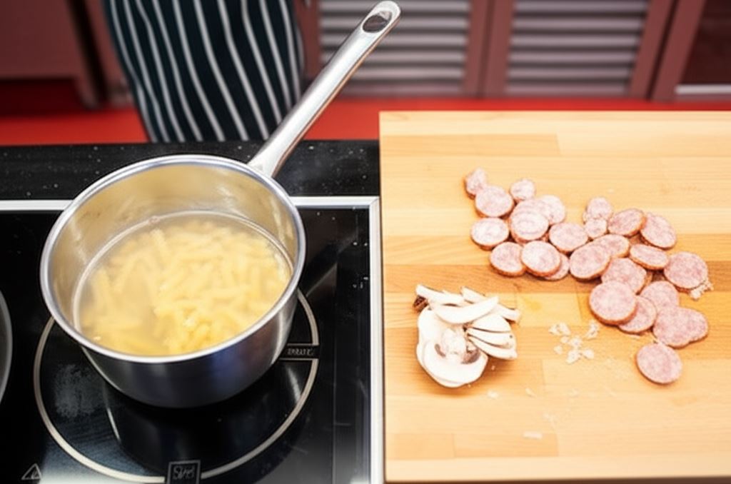 Pieczarki, cebulę oraz kiełbasę pokrój na plasterki. Makaron ugotuj.