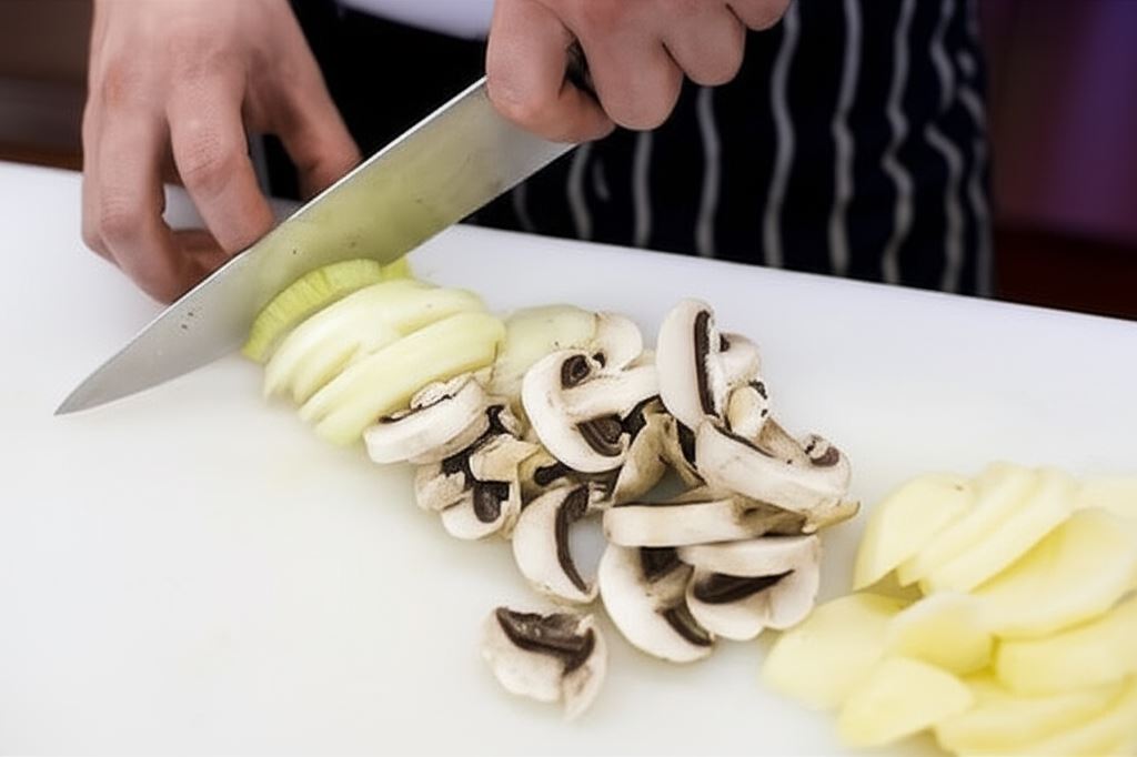 Ziemniaki starannie opłucz. Ziemniaki, pieczarki i cebulę pokrój na plastry o grubości 0,5 cm.