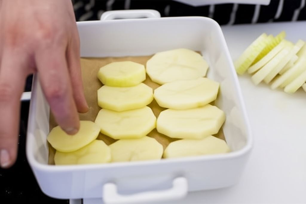Spód naczynia żaroodpornego wyściel papierem pergaminowym. Potem ułóż warstwę ziemniaków.