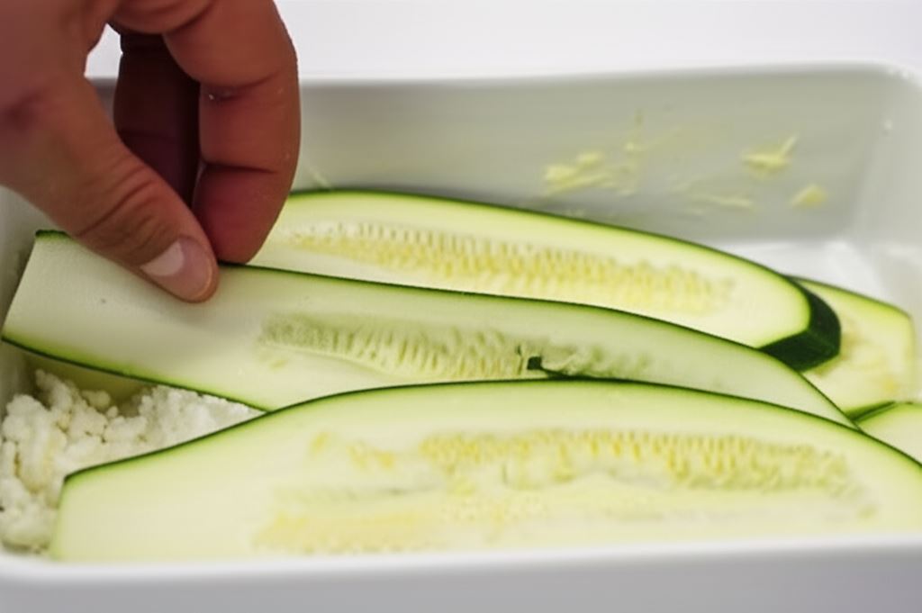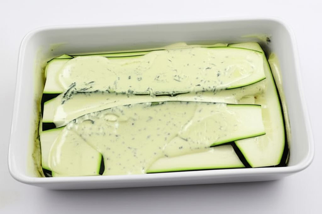 Naczynie żaroodporne posmaruj masłem i umieść warstwami składniki: na przemian cukinia i bryndza.