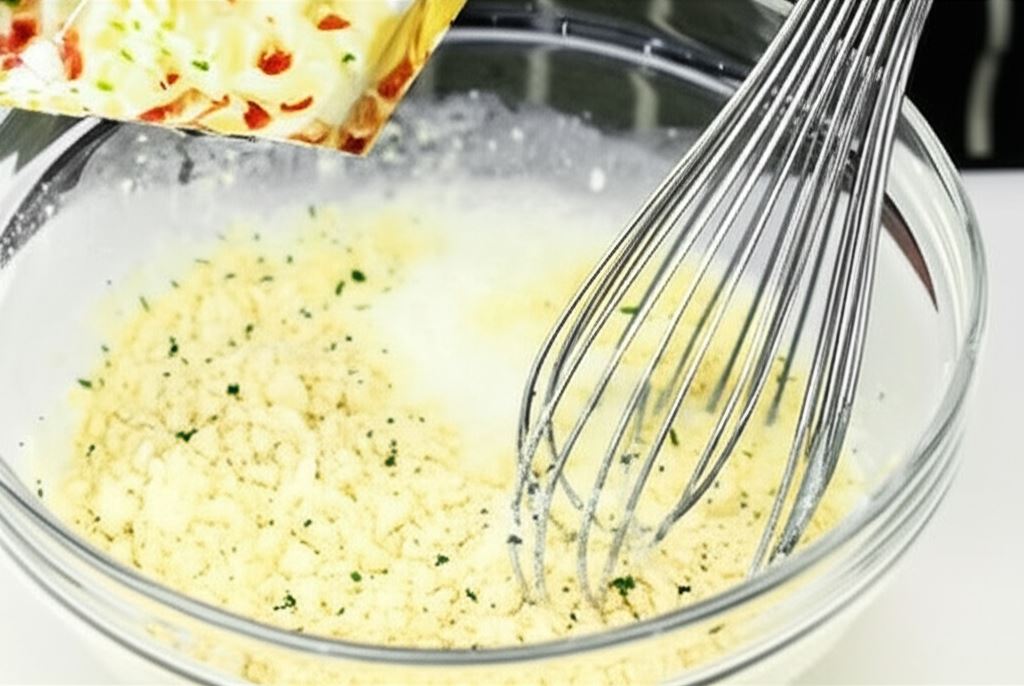 Jajka roztrzep ze śmietaną. Wsyp czosnek z bazylią oraz Fix Knorr. Mieszankę ponownie starannie wymieszaj.