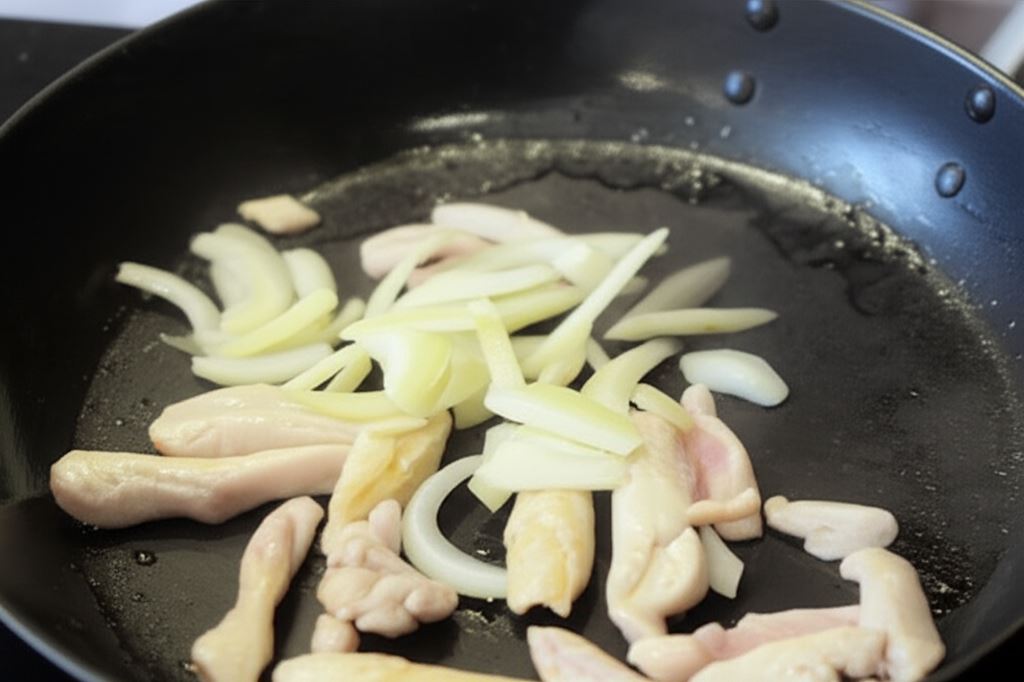 Kurczaka pierś pokrój w kostkę i przysmaż na złoty kolor.