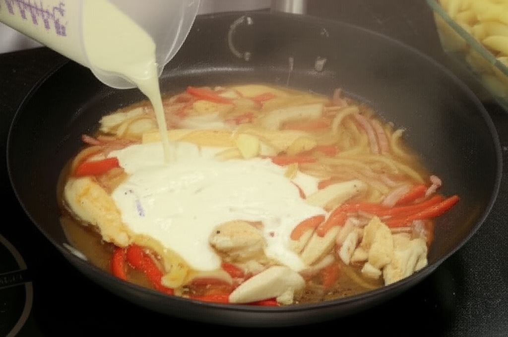 Wlej 300 mililitrów wody, śmietanę oraz Fix Knorr. Zamieszaj wszystko, doprowadź do wrzenia i połącz z makaronem.