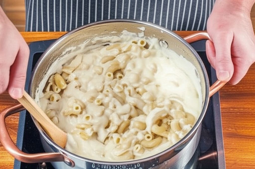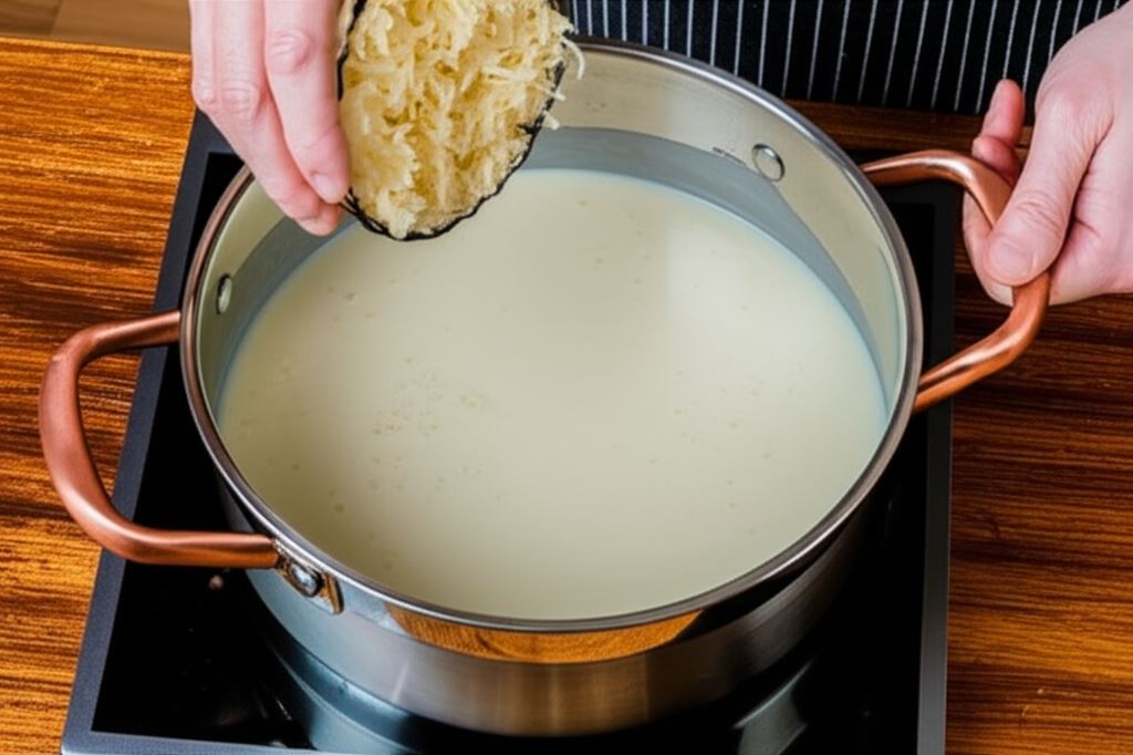 Podgrzej mleko w rondelku. Zmieszaj mąkę kukurydzianą z wodą i dodaj do mleka. Ogrzewaj aż zgęstnieje. Wsyp oba typy sera i mieszaj do momentu rozpuszczenia. Potem dodaj majonez Hellmann's i starannie wymieszaj.
