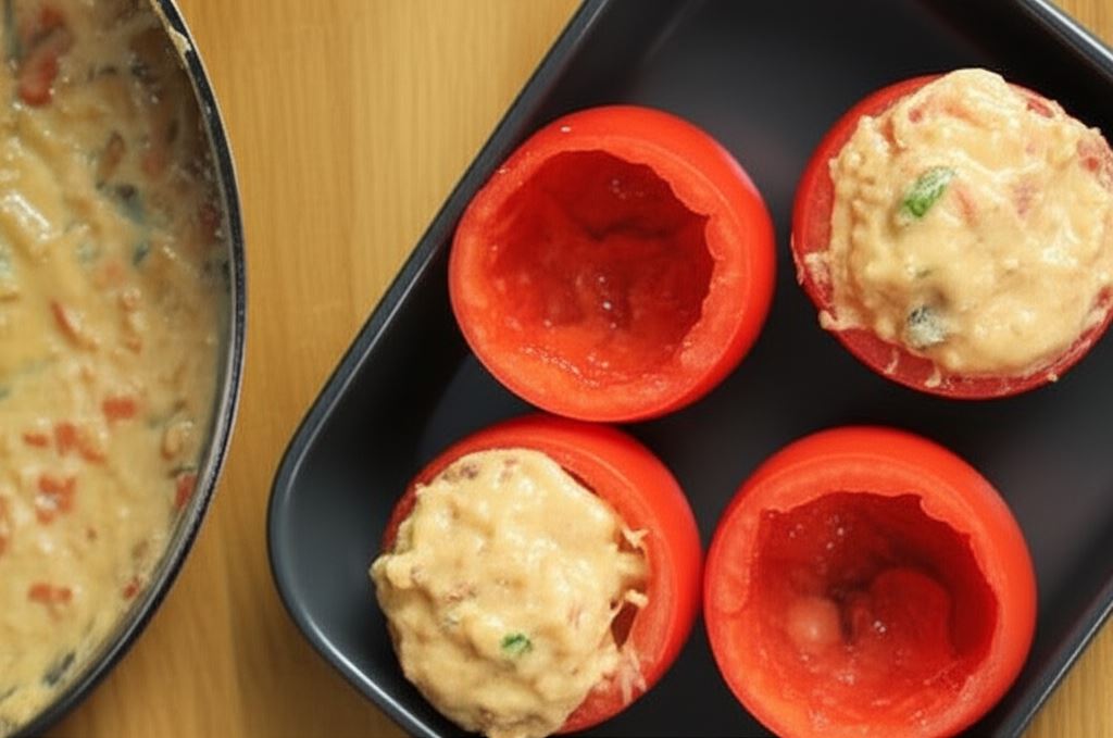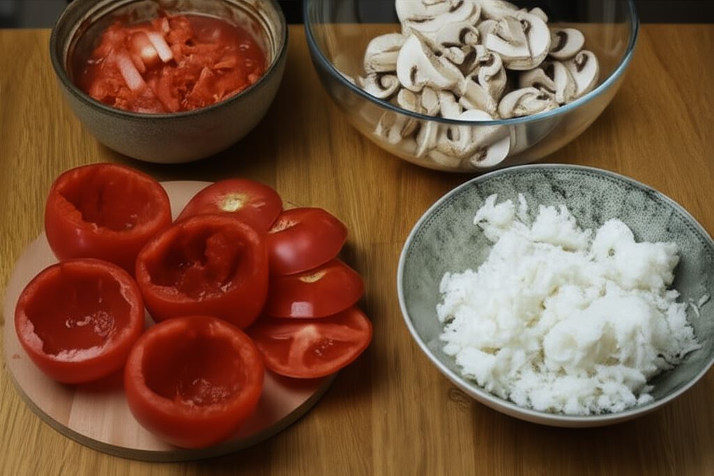 Soczyste pomidory wypełnione aromatycznym farszem z ryżu i grzybów to propozycja, która zachwyci podniebienia wszystkich miłośników lekkich, ale sycących dań. Ta zapiekanka w pomidorach to prawdziwa uczta dla zmysłów – intensywny smak pomidorów doskonale komponuje się z delikatnym ryżem i wyrazistymi pieczarkami, tworząc harmonijną całość, której trudno się oprzeć.