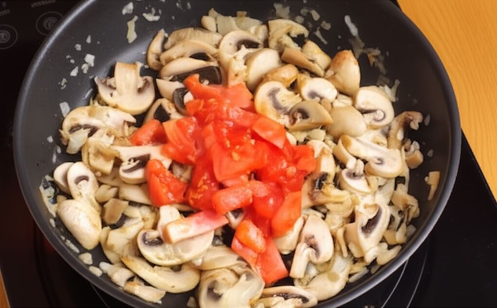 Cebulę posiekaj w kosteczkę, szczypior drobno pokrój. Cebulę przesmaż na patelni na rozgrzanym oleju, wsyp pieczarki, smaż moment, dodaj miąższ pomidorowy, duś całość razem przez około 2-3 minuty, dopóki nie odparuje część wody z pomidorów.