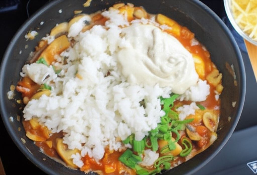 Do składników na patelni wsyp ryż i szczypior, całość zalej Fixem Knorr, dorzuć ser i gotuj jeszcze przez 2-3 minuty.