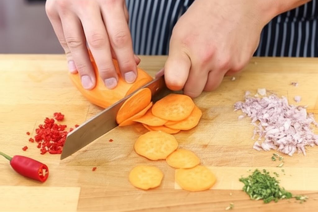Obierz bataty i szalotkę. Ziemniaki pokrój na cienkie plastry, szalotkę posiekaj w drobną kosteczkę. Drobno posiekaj chili i rozmaryn. Rozmaryn podziel na dwie porcje.