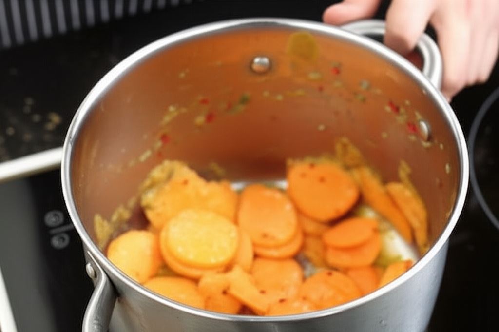 Na rozgrzanej oliwie w garnku zrumień szalotkę i chili, wsyp plastry ziemniaków, smaż przez dłuższy moment ciągle mieszając. Zalej wszystko sokiem pomarańczowym, połową śmietany, wsyp rozmaryn, mieszankę włoską, dodaj syrop klonowy i imbir. Gotuj całość dopóki sok i śmietana całkowicie nie odparują, a ziemniaki staną się półmiękkie.