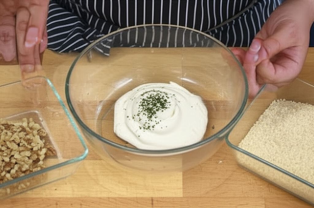 Wymieszaj śmietanę z majonezem, tartą bułką, pokruszonymi orzechami, pozostałym rozmarynem. Bułkę umieść na górze zapiekanki. Całość włóż na około 20 minut do rozgrzanego do 170*C piekarnika.